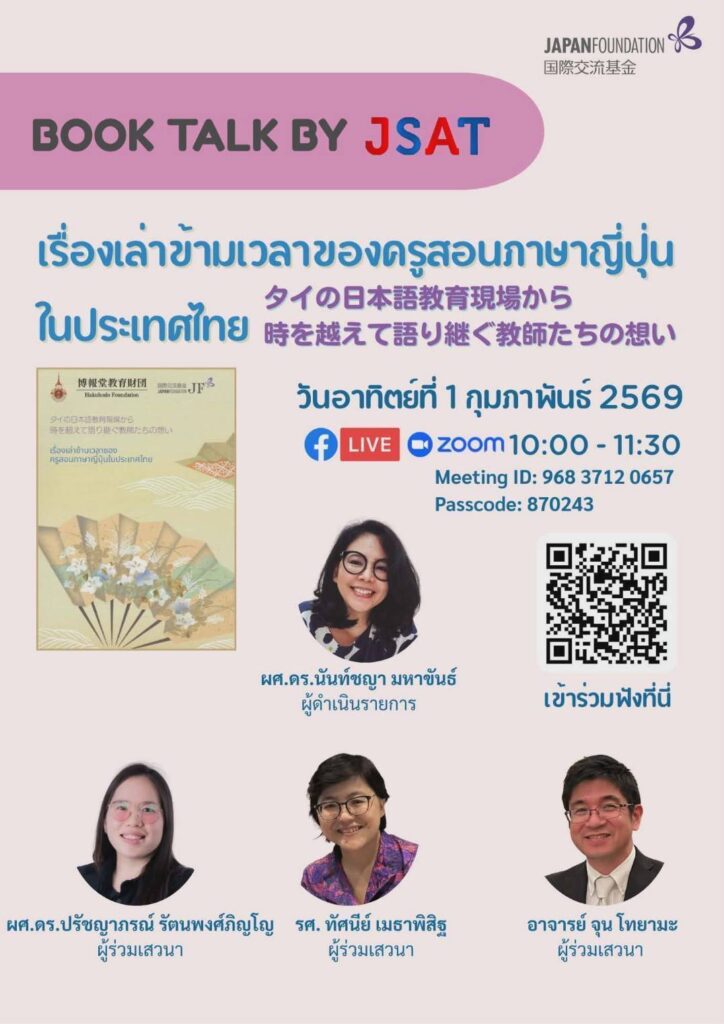 | 17/03/2566 | เรื่องเล่าข้ามเวลาของครูสอนภาษาญี่ปุ่นในประเทศไทย | อ.เอบิฮาระ และ คณะ | ผศ.ดร.ปรัชญาภรณ์ และ อ. จุน โทยามะ | ผศ.ดร.นันท์ชญา มหาขันธ์ | ![]() |
